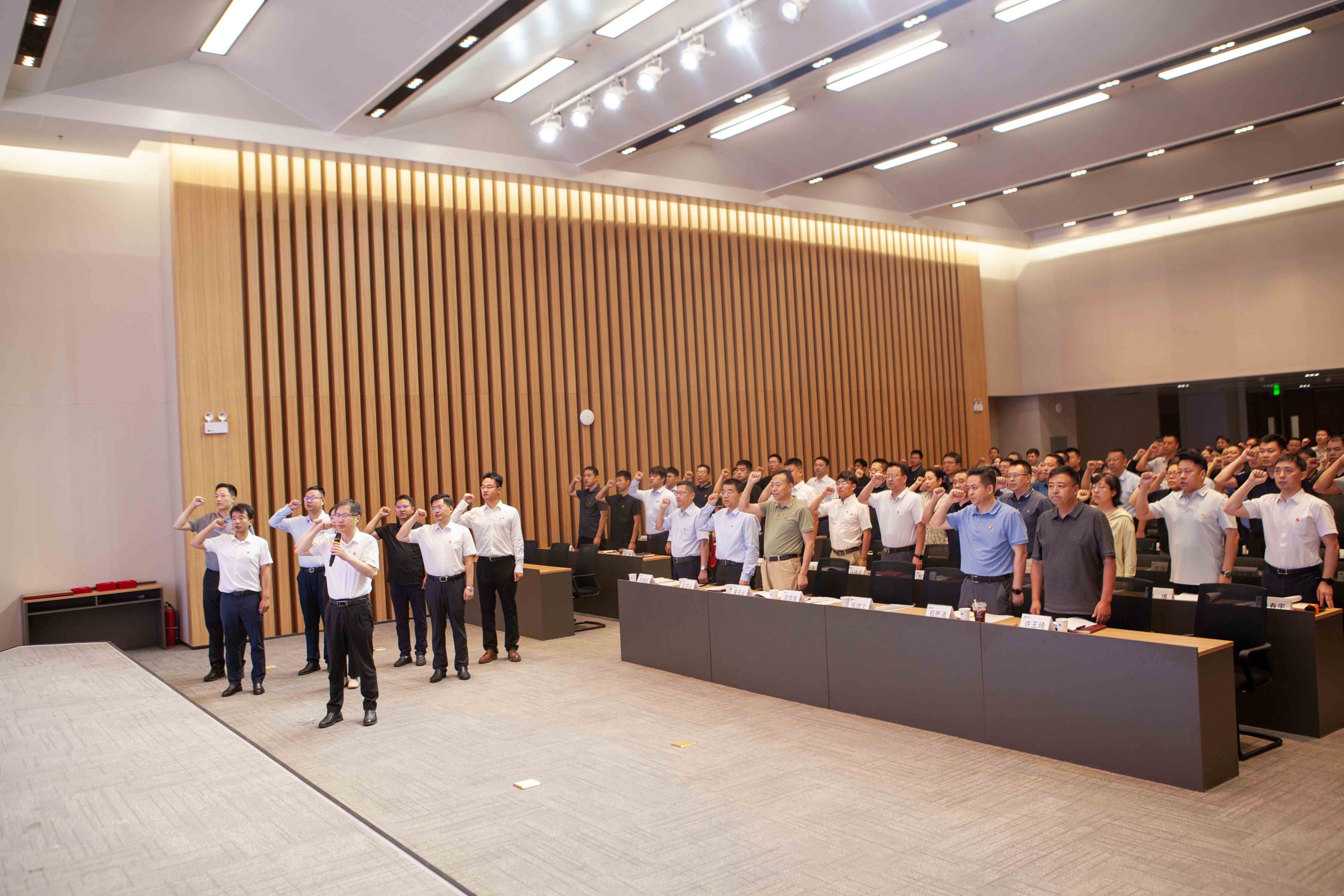 公司新黨員面向黨旗莊嚴宣誓,全體黨員一同重溫入黨誓詞。