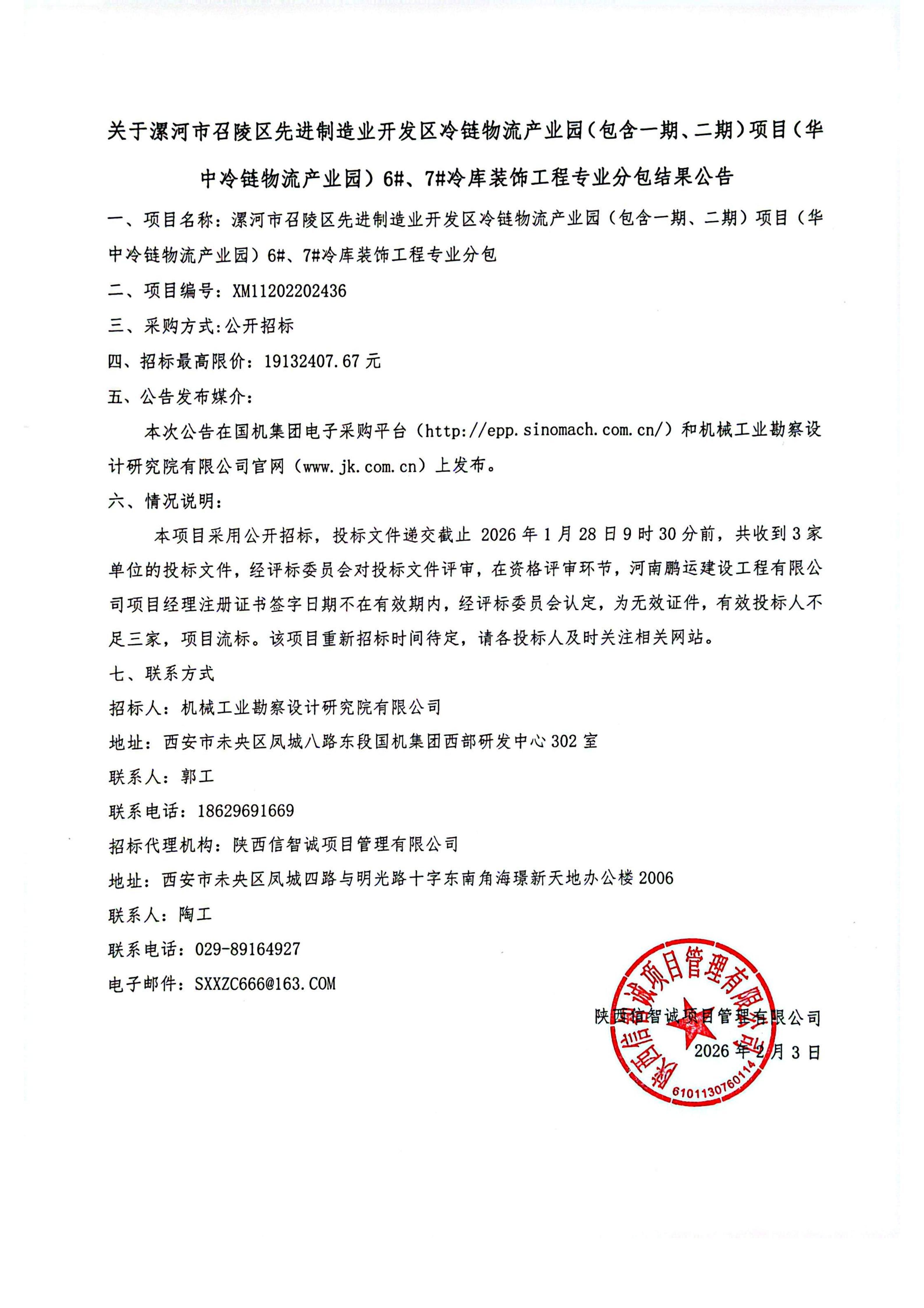 漯河市召陵區先進制造業開發區冷鏈物流產業園(包含一期、二期)項目(華中冷鏈物流產業園)6#、7#冷庫裝飾工程專業分包流標公告